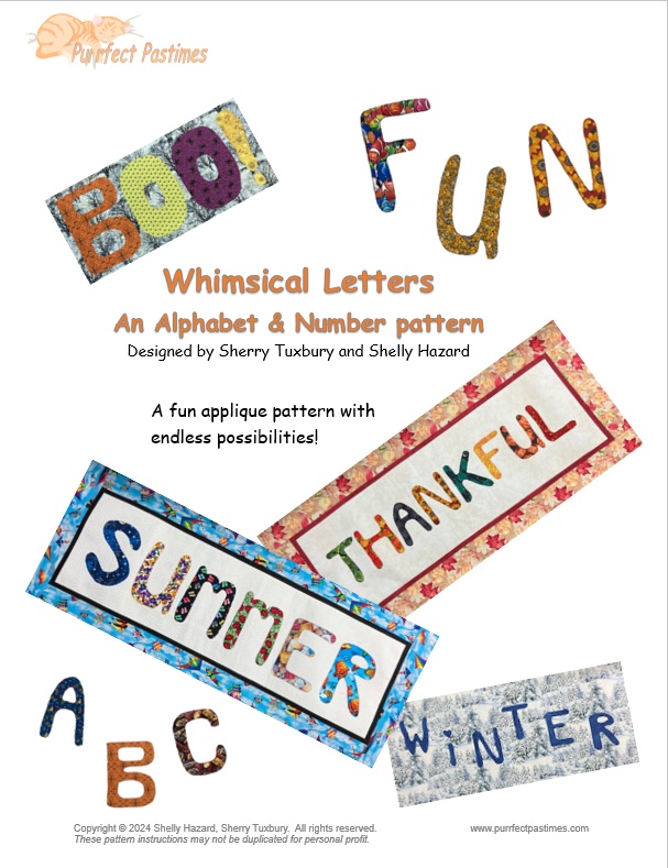 Whimsical Letters is our new alphabet pattern – creatively designed by Sherry Tuxbury – providing 42 pages of fun and possibility! The pattern includes the letters A-Z, numbers 0-9, and an exclamation point! The letters are sized to a full page, a suitable size for making signs, and an average size chart is included for reducing the letters to 75%, 50%, and 25%. Instructions for how to machine applique the letters is also included. Jump into creativity with these whimsical, fun letters that you can use virtually anywhere – create a sassy wallhanging, add your daughter’s name to her baby quilt, create seasonal table runners to celebrate the holidays, add words of inspiration everywhere! Just to offer a few ideas!